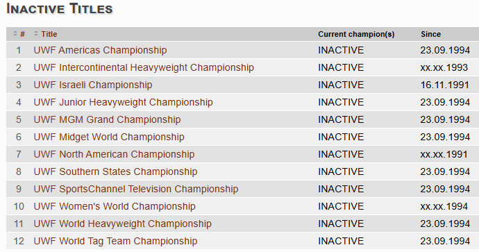 This isn’t even in the ring. It’s pre-taped. His guest is B. Brian Blair because apparently the company is being built around him. I can think of a fair few guys I’d go with before resorting to Blair as my #1 babyface. I went to see who they eventually put their strap on and couldn’t figure out what the hell title was the top one. Here’s a list of them: