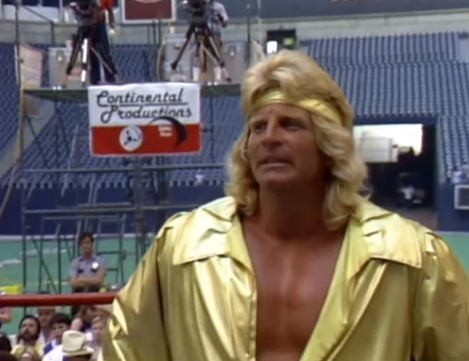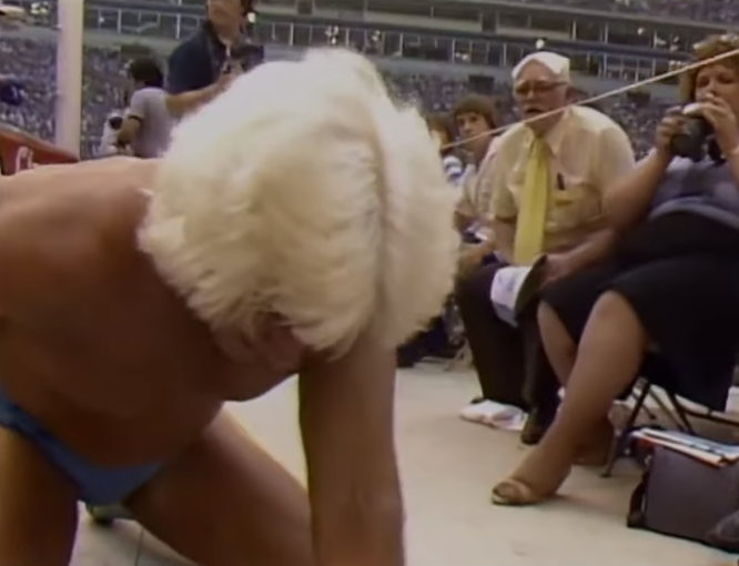 The champs get the whole music video treatment, then come out here and lose to the Von Erichs. The ‘belts’ are a giant trophy. The Von Erichs, not to be outdone musically, come out to “Stranglehold” by Ted Nugent. Fritz is 55 years old, going on 80. Kevin Von Erich was a really good wrestler too. Mike is a different story. He never wanted to be a wrestler and only debuted last year. He lacks the physical prowess of his brothers, but he looks like David and Fritz smelled money. The pressure was too much for young Mike, who committed suicide in 1987. He was only 23. At the start the ref tells the wrestlers he’ll only allow one v one action but he can’t control it. It turns into a donnybrook with multiple bladejobs, Gordy hitting people with his boot and Kevin beats Roberts with a crossbody in under ten minutes. This was a wild brawl. If it had been allowed to get properly out of control it was an easy recommendation. As it stands, they rushed it too much and it needed more time. There were too many moving components to do 7+ minutes and fuck off. It was a HOT seven minutes though. ***
