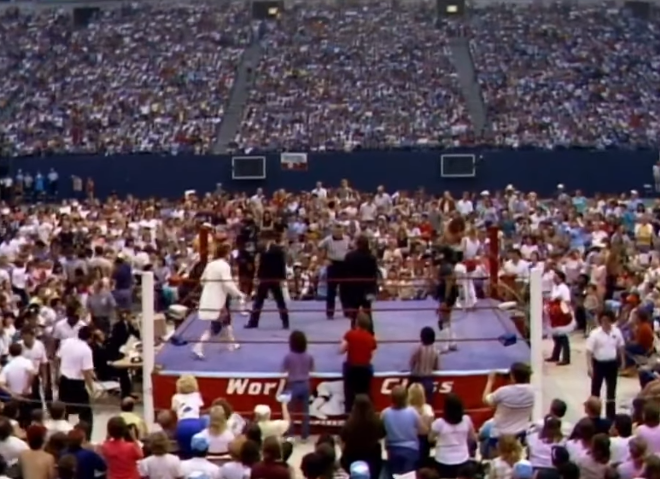 A glimpse at the arena before we kick things off. It’s huge and it is packed. This was a huge draw for Von Erich. They claim 50,000. It isn’t but the positioning of the cameras hide the truth. WCCW would claim the biggest attendance in wrestling history. Showdown at Shea (1980) says otherwise. WWF claimed over 36k for that show. Obviously, 50k would beat that but there aren’t 50,000 people here.