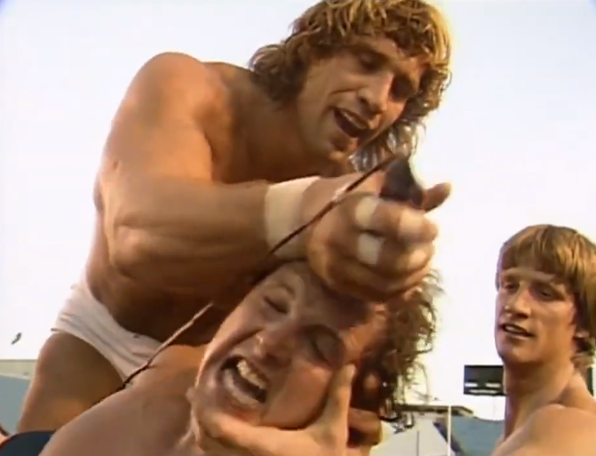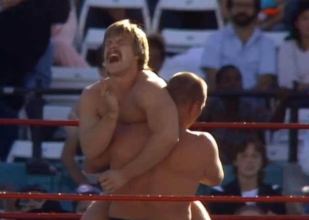The losing team here has their heads shaved. Everyone involved in this is very talented and the match is fast paced with the Von Erichs pulling out flash pins to counter the heel teaming of the Dynamic Duo. Both Von Erich boys eat the heat. This is a rare match for 1985, outside of Japan, because they do a lot of near falls. There’s plenty of unscrupulous cheating from Gino too. Including an assault with a chair. Not a folding chair, a chair he plants on Kerry, attempting to stab him. Chris Adams superkicks in this all look great. I don’t know why they didn’t just stick to that as a finish. The heels miscue with a powder shot and a blinded Chris Adams gets rolled up by Kerry for the pin. ***¼.