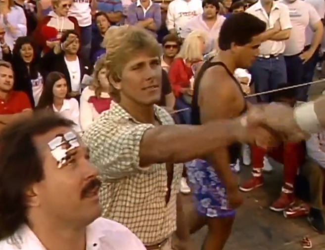 I’d question the wisdom of having Gang in this match, where he’s a punching bag. He’d still be feuding with Parsons come the Parade of Champions in May 1986. Parsons ignores the rules and uses Irish whips and such. It does not help the quality of the match.