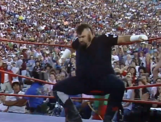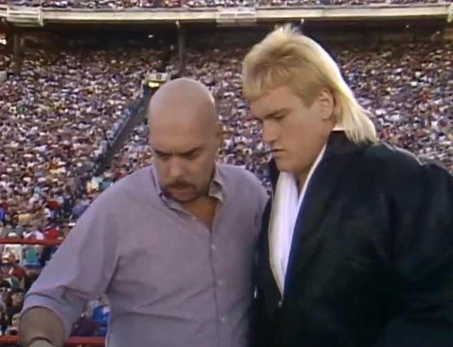 Lance is one of the lumberjacks for tonight’s main event. Sorry the “Mane Event”. Get it? Because hair? Chris Von Erich is at ringside too. The never-ending Von Erich tragedy soon to envelope him too.