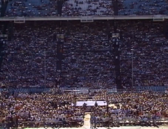 Bill Mercer is the host for once. He always seemed to be busy for these things. Marc Lowrance has to make do with ring announcing. They bring out Polly Stevens to sing “God bless America” and she takes her sweet time over it. Mercer claims this is “possibly the biggest crowd in the history of professional wrestling”. Nope! They later claimed 40,000 people. I know it looks like a lot but it’s not that many.