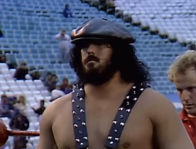 This is Spike Johnson, for anyone interested. They’ve basically brought in a big dude in S&M gear so Mike has someone to beat. He was in WCCW for a couple of months, just doing big man jobs for anyone and everyone. Mike claims to be 225lbs but he’s not. He’s probably around 190lbs. A year ago, after defying death, he was down to 140lbs and very sick. In addition to toxic shock, he had a car crash earlier in the year and sustained head injuries. The sheer number of vehicle crashes the Von Erich’s had were staggering. How can Kerry and Mike have serious ones the same year?