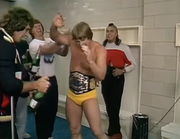 Backstage, Kevin talks about how this belt belongs to David von Erich. The whole family comes in to celebrate. Fritz, miserable old fucker, wants Mike to win a title because “he’s behind”. The look on Mike’s face is horrendous. The poor fucker.