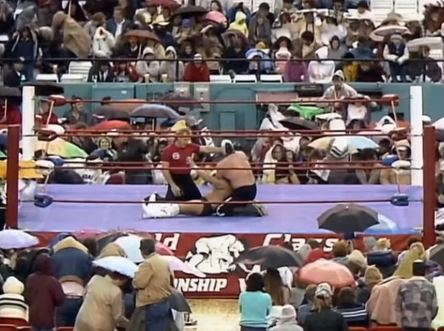 Grappler is Len/Lyn Denton. Casey would finish up in WCCW and become a WWF jobber. Denton would be heading to Portland, where he’d keep going until 1992 as the Grappler. Comms mention they had a “Blue Northerner” today, which in weather terms, for those not from Texas, means it’s colder than usual but still warmer than anywhere else. That probably hasn’t helped ticket sales. The match is predictably mediocre. Neither guy is particularly good. The timing is off on the strikes. The grappling feels too cooperative. As they’re in a chinlock it suddenly starts raining like MAD.