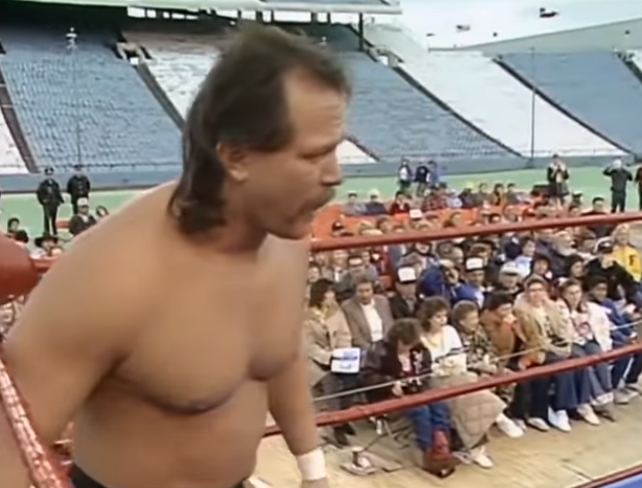We’re in Dallas, Texas at the Cotton Bowl. Host is Bill Mercer. The attendance here is a measly 5,835, an enormous drop off from the killer crowds they were doing in 1985. 1986 was a bad year for World Class. In February Gino Hernandez, one of the territories top heels, was found dead. Rumours began to swirl about the circumstances. Was it drug related? Was Gino dealing coke on the side? Was it a mob hit? Whatever the truth, it wasn’t good for the territory. Also, Jim Crockett Jr had decided to cut ties with Dallas in 1986, which led to the territory debuting its own world title. The head booker, Ken Mantell, quit and joined Bill Watts’ UWF.
