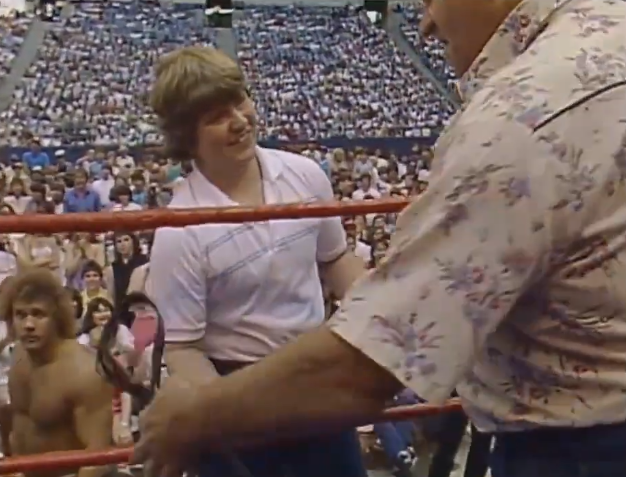 Despite this the challengers were introduced as “The Von Erichs”. Mike is among the lumberjacks.