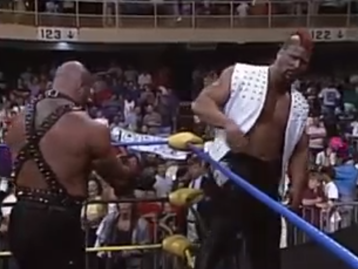 Red Rooster has returned to the NWA and finds himself straight into ‘mid card jobber’ territory. Nasty Boys just joined WCW a few weeks beforehand. They’re green but, honestly, they’ll never get any better. The Nasties do benefit from being quite stiff. So at least they lay it in there. It looks miles better than the shit the Master Blasters were doing.