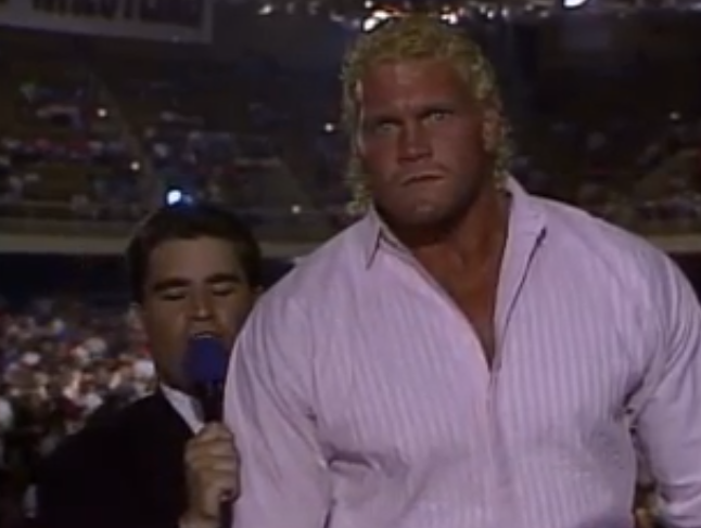 An irate Sid lays down a challenge to Sting for the world title. That’ll make a nice change from Sting wrestling various goobers under a hood for the next three months.