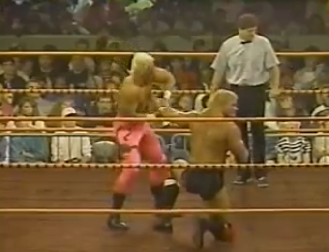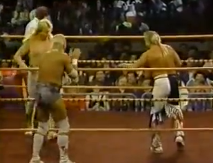 Chris and Mark Youngblood are the Renegade Warriors. Boy, do they suck. Freebirds are in their Little Richard Marley phase. The Freebirds generate decent heat, but the crowd don’t care about the Renegades. It doesn’t help that they do a combination of stupid and boring spots. The crowd is DEAD for it. The crowd get audibly restless with how boring the Renegades are. They control with headlocks and armbars. Just have the heels control instead. PS Hayes isn’t in much better condition. His bumping in this is horrid.