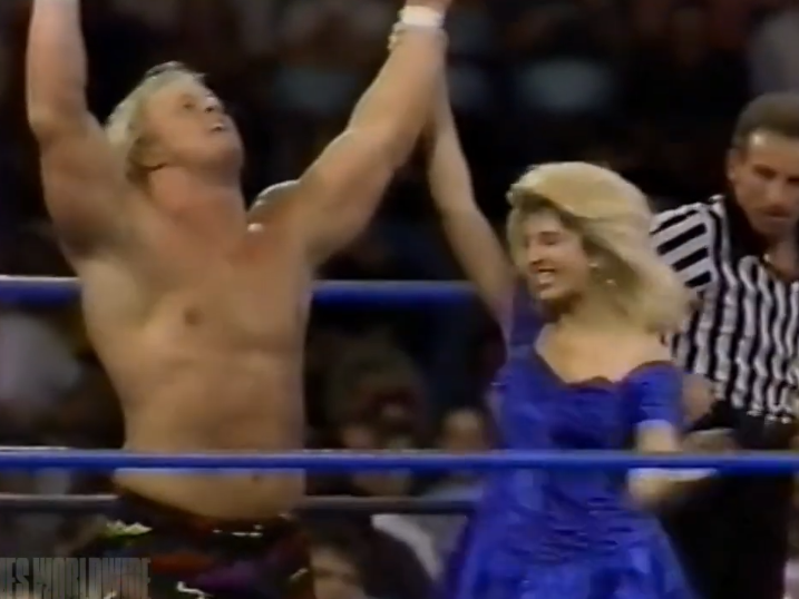 Stonecold is “Stunning” Steve Austin here, accompanied by Vivacious Veronica. His valet would be replaced by his girlfriend Lady Blossom aka Jeanie Clarke, who he would end up marrying in 1992 and having two kids with. What I didn’t realise is that Clarke, a UK citizen, had been married to Billy Jack Haynes prior to that in order to get a green card. Austin of 1991 is a Flair clone. He’s got long blonde hair and a sparkly robe. The crowd are dead quiet as he runs through spots. To be fair to them, he’s fairly basic at this point.