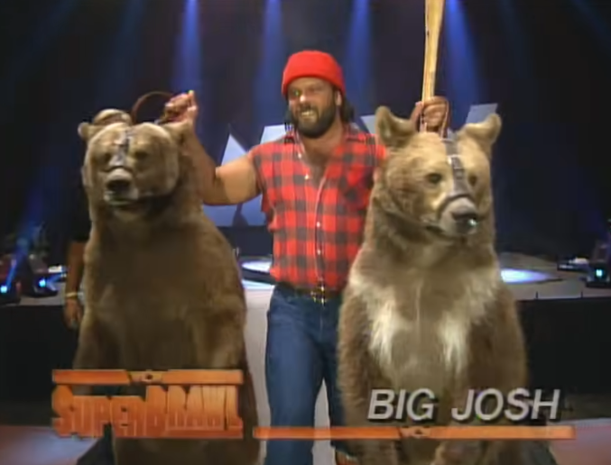 Big Josh is Matt Borne with a lumberjack gimmick. As with various WWF guys at the time, he has an animal gimmick in his corner. TWO BEARS. TWO ACTUAL BEARS. Surely, that’s a fan chucking a beer away from someone getting mauled.