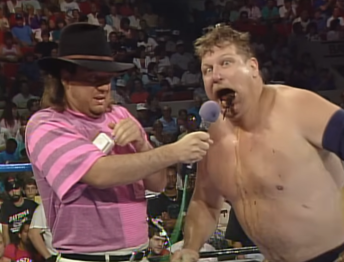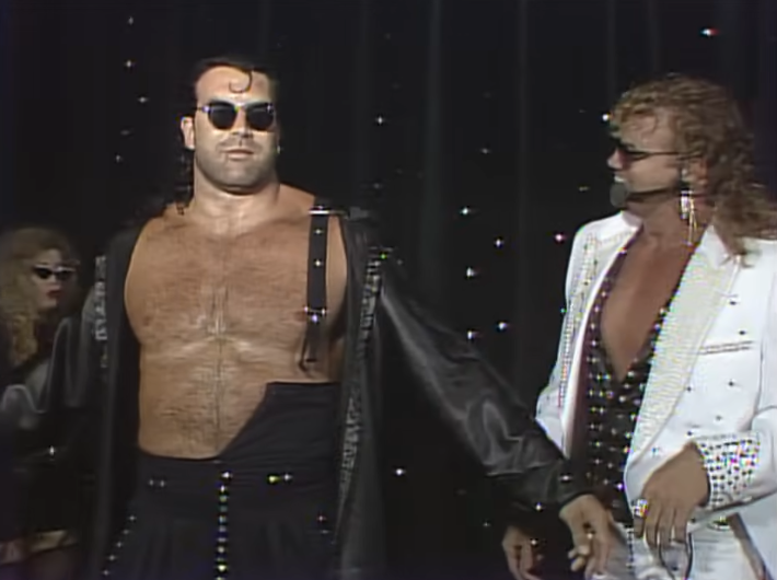 HAAAAAA. As if they debuted Nash and Hall on the same show and gave both of them gimmicks this bad. Scott Hall had been a super rookie with AWA, wrestling under the name Scott Hall, but for some reason WCW felt the urge to gimmick him up the wazoo. Focusing entirely on his body. Hall flicks the toothpick at the camera and misses. “That was…uhh…quite the debut” says Jim Ross.