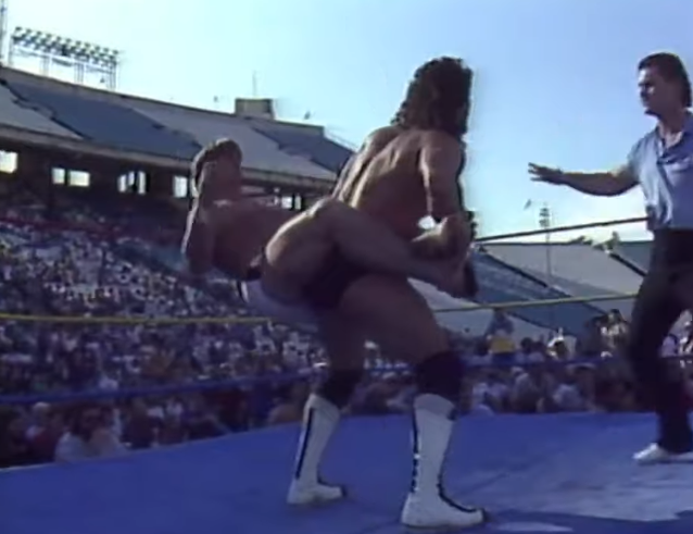 We’re in Dallas, Texas at the Cotton Bowl. Attendance is a paltry 3,700 and this is probably my final WCCW/WCWA show. To watch Dallas, as a territory, slowly die while the von Erich family systematically fall apart and literally die, has been surprisingly painful. The first Cotton Bowl show in 1984 drew 12,000 people. 26,000 attended when the Von Erich’s shaved the heads of Gino Hernandez and Chris Adams in 1985. That was the peak of the Von Erich power. Just two years later, it’s a sad, sad scene. WCWA has changed their music and entrance and everything and it just sucks. They can’t even get highlights for their videos that don’t have empty stands in the background.