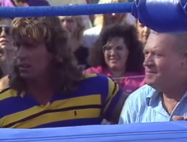 Borne comes out with Old Glory to endear himself to the Americans in the audience. I respect how Borne went to rebuild his career and reputation only to get saddled with the Big Josh gimmick in WCW and then Doink. Wrestling isn’t fair, man. Borne’s camo here is a bit confusing. He just looks dirty. Camo tends to be something you use to hide. He looks like a dumbass. The match has some decent technical skill in it, although Sheik is half-assing it. They end up brawling around ringside and Sheik feeds Borne the back like three times. We’re before the era of unprotected chair shots, thankfully. Both guys get counted out. I’m guessing Sheik had a ‘no jobs’ clause in his WWF deal, bubba.