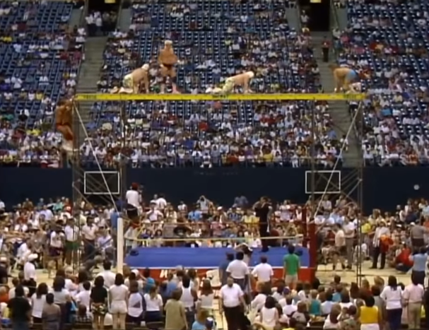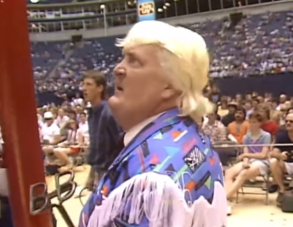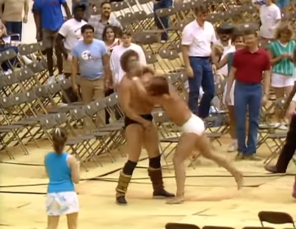 Kevin is wearing Mike’s ring jacket and carrying a yellow rose to represent his other brother David. I would show you a picture but Nord keeps walking in the way. HUSS! HUSS! HUSS! Apparently, they were hoping to get Antonio Inoki for this match. INOKI? There’s no fucking way Inoki jobs to Kevin von Erich. And I like Kevin. Nord is a guy that looks ok on offence, because he just hits people, but looks terrible when he’s selling, because he can’t act. HUSS! He can huss though. What is a huss? What isn’t a huss? There’s a spot in this where they fall outside and I’m pretty sure Nord isn’t expecting it like it happens because he goes straight down into the apron. That’s the hardest part of the huss! It looks sick enough to finish, which is good because they get counted out.
