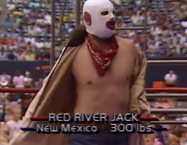 Red River Jack is Bruiser Brody under a mask. If Abby’s team wins, Red River Jack has to unmask. If the babyfaces win, Brody gets five minutes alone with Gary Hart. He can kiss and cuddle him all he likes. I mean, he gets to beat him up!