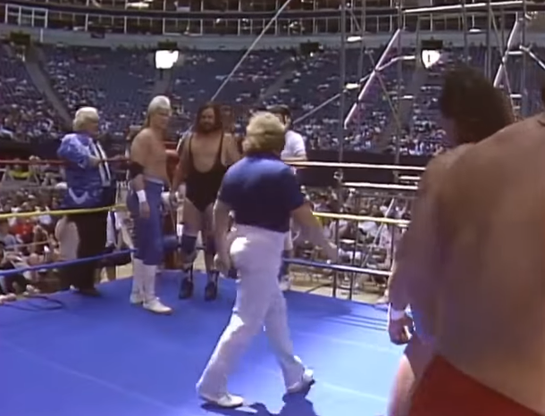 They brawl out into the ringside seats that are off camera and holy shit, this is tragic. There’s like 10 people this side of the ring. They should have brawled in the other direction. At least they’ve got lebensraum. Compare this outcome to Hogan vs. Andre at WrestleMania III. They couldn’t put their top guy over John Nord?