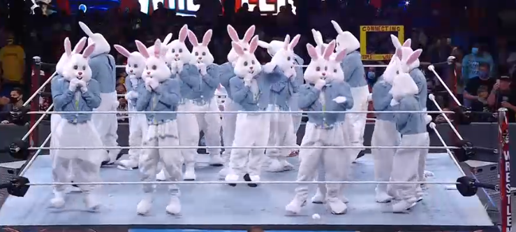 I’m not being wilfully ignorant here I just don’t keep up with music. I did but I basically stopped around the time when Nu Metal died off. Anything before that and I know what I’m talking about jack. Bunny is noticeably smaller than the trained wrestlers and is very lightweight. Miz is very good at making other guys look good. I said that about Cesaro earlier but he does it through technique. Miz does it by showing ass. He’s not afraid to look like a chump. There’s a reason he’s had a job in WWE for as long as he has. Bunny is very impressive. His selling is decent and his lucha stuff is really strong. When celebrities turn up with this level of prep you can’t really fault them. There are obviously some flaws there because selling is complex and you can’t just learn how to move around a wrestling ring in three months no matter how naturally gifted you are. He’s aided by Miz and Morrison being so good.