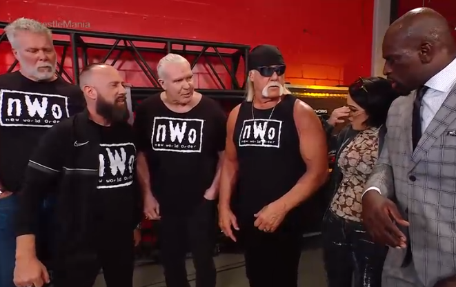 The New World Order are chatting when Bayley interrupts and gets love from X-Pac and Scott Hall. Hogan doesn’t reciprocate because he found out Bayley is Hispanic.