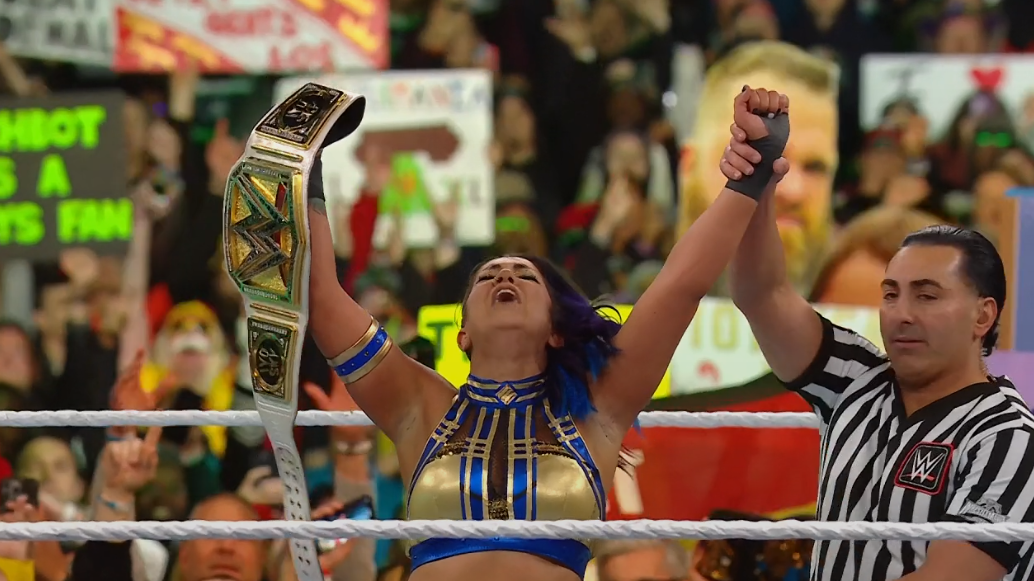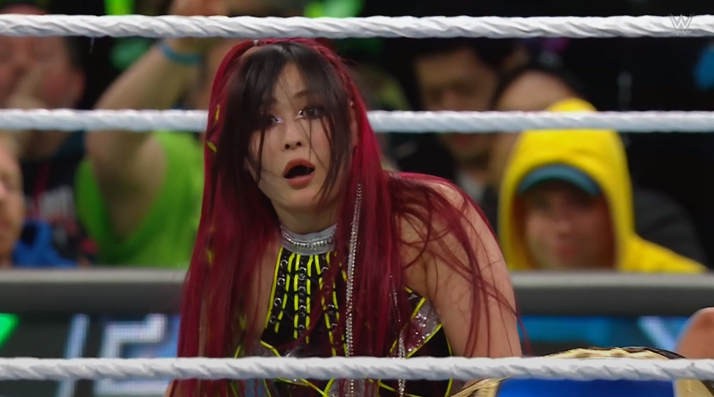 Unlike LA Knight earlier, Bayley is consistent with her selling. I have bad knees and Bayley wrestles here like she has bad knees. Not every step is murder, but you use them for anything, it’ll hurt. I love seeing Io next to the guardrail because it reminds me how tiny she is. 5’1”. She still comes across as a mean person though. The crowd have been singing the “hey, Bayley” song basically all match, which reflects how beloved she is.