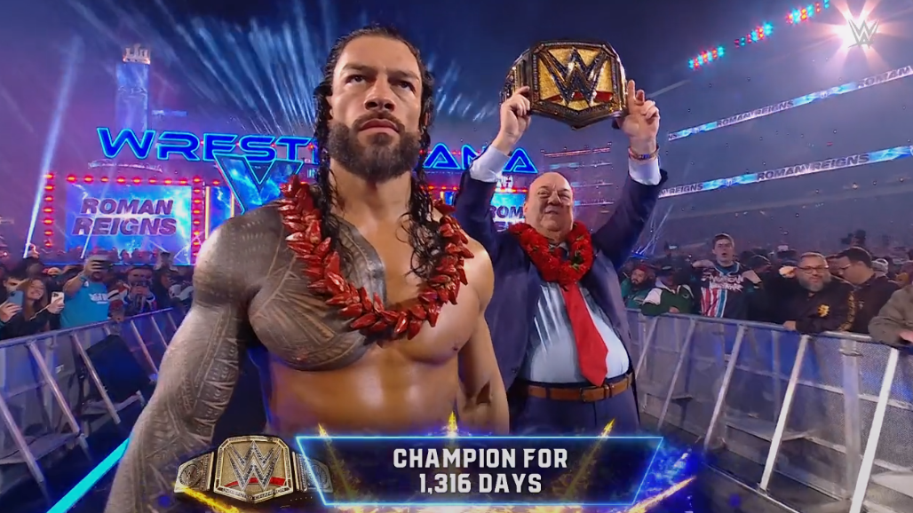 This is Roman’s ninth Wrestlemania main event, the most of anyone, ever. Although it gets easier to rack those up when you main event both nights in the same year. As Roman steps into the ring there are still 55:00 left on the show*. Jesus.
