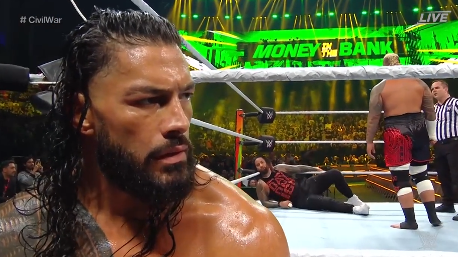 This is Roman sulking after a chant of “stand up if you hate Roman”. The heat continues unabated. This is so boring. They waste 20 minutes of the main event doing nothing at all. Surely the solution here was for the Usos to beat the shit out of the heels for a big old shine before they go into the heat but no, just 20 minutes of heat. When Jey finally gets the hot tag we have to suffer through Solo selling. Roman is completely off his game too, constantly chasing that ugly Superman Punch, his worst spot. Just to really piss me off they work in a shitty ref bump FOR NO REASON. Solo then puts himself through the announce desk FOR NO REASON. They put in stupid sequences like Jey hitting a superkick and Roman bouncing off the ropes to hit a Spear. Jey gets yet another hot tag and splashes Roman for the win and gives Reigns his first pinfall loss since December 2019.