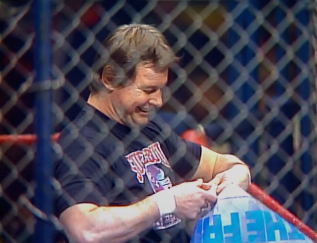 Piper, looking to endear himself with the locals, comes out with a Chicago Bears Superbowl Champions t-shirt on and sticks a poster of William “Refrigerator” Perry up inside the cage. For those not familiar with NFL history; in 1986 the Superbowl was Mike Ditka’s Chicago Bears vs. New England Patriots. The Bears won 46-10 and just massacred the Pats in one of the most one-sided Superbowls on record. Naturally the Boston locals are less than thrilled at Piper reminding them of this. Bruno starts heavy and Piper takes a few headers into the cage, blatantly blading on camera three times. Jesus Roddy, at least try to cover it up!