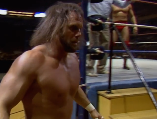Hinterwäldler Jim in German. The trouble with this match is that Studd is supposed to be this enormous dude, but Jim is also enormous. Studd is, technically, three inches taller but they’re the same height. I’m reminded by Monsoon that Hillbilly Jim started out as a planted fan called “Big Jim”, who Hogan taught to wrestle. The lack of effort here is palpable. They do a bearhug and there’s nothing to it. They’re just resting. They brawl outside and Studd gets counted out.