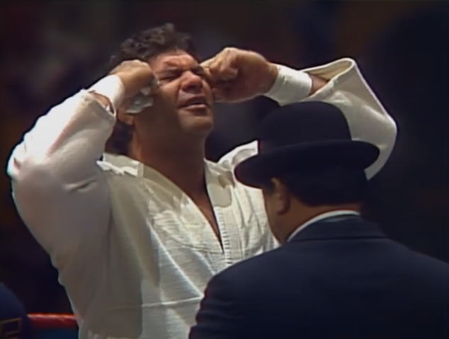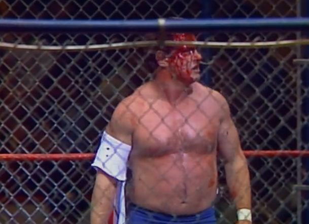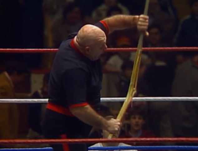 I never liked cage matches where the aim is to escape. Win your blood feud by running away! It should be a cheap way for the heel to win. Bruno wins this by crawling out of the door and bashing Piper with a chair to stop him from following. Lame. There was a lot of claret here but not even slightly concealed by Piper. It’s a pass from me.