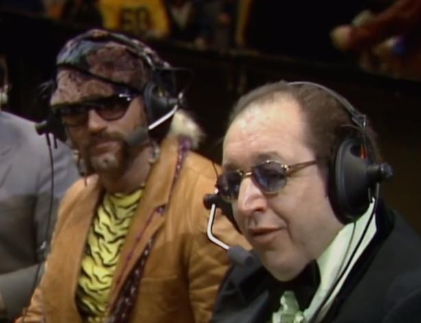 “Kung fu karate shot” is the standard of Gorilla’s commentary on this one. It was an Enzuigiri. There’s another fight in the crowd so Muraco takes a powder. No point working if no one’s watching.