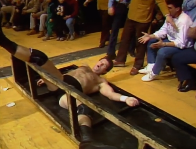 Comms spend most of the match laughing at how dumb everything looks. Iron Mike Sharpe was an artist. Iron Mike suggests a test of strength, which he loses. Loudly. “ARRRRRGH. ARRRRGGGH. AAARRRRRRRRGH”. Someone should just steal Mike Sharpe’s whole gimmick wholesale. It’s so different that I reckon it would get over. If Twitter was around in 1986, people would have been crying out for the Iron Mike Sharpe push. He’s certainly more entertaining than the one-trick pony that is the Corporal. The trouble is, this being 1986, it’s over. Sharpe loads up his forearm pad but Kirchner blocks and bashes Mike in his own face with it for the win. That looked as stupid as it sounds, if that helps. This was a tremendous little match. I have a new love for Iron Mike Sharpe. I always liked him but his shtick would work with anyone. Like George Steele or Ric Flair. He could just take that match and have it with any body.