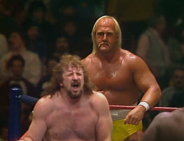 Terry Funk is teaming with Dory here, although Vince has renamed him “Hoss Funk” for reasons. Dory was a former NWA champion. They didn’t rename Dusty Rhodes Blobby Rhodes or Ric Flair Nick Flair did they? JYD and Terry have a feud coming in and will work together in a tag at Mania 2. I think Hogan comes in to “Real American” but the pop is so loud, I can’t actually tell. Hogan has his ribs taped, courtesy of King Kong Bundy breaking his ribs. I personally wouldn’t have had him wrestle at all to sell the injury but tickets need to be sold.