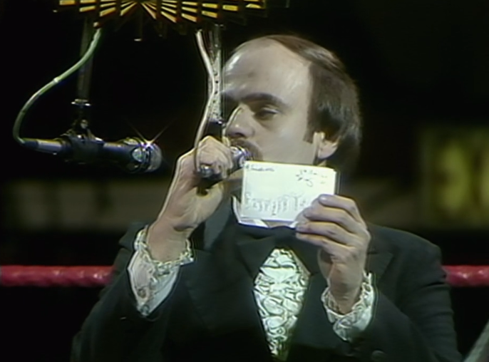 We’re in MSG, as the title suggests. Hosts are Gorilla Monsoon and Pat Patterson. Ring announcer is one Howard Finkel with frilly sleeves.