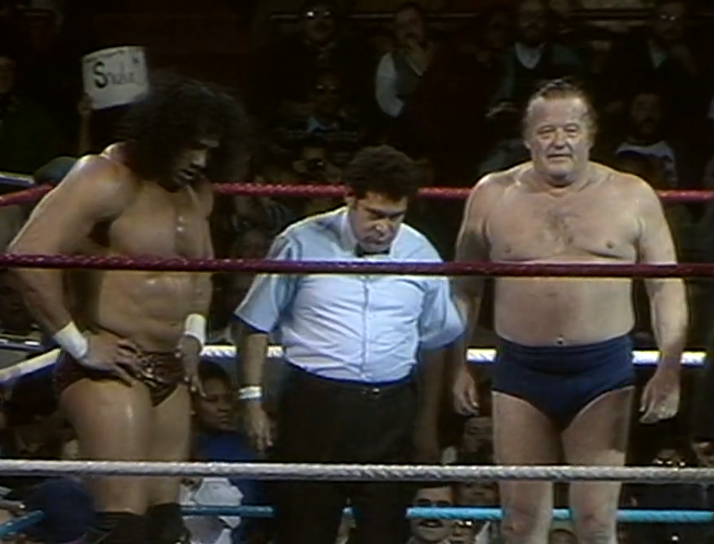 This is a wrestler + manager tag gimmick, although Albano wrestled loads around this time. Skaaland is a rarity. He worked last month in Philly but before that it was a couple of years. He officially retired in 1978. The result is huge pops for everything he does. It helps that he’s the manager of babyface world champion Bob Backlund. You’d think he’d be more focused on Backlund’s big title defence tonight. I wonder if that will have any effect on the outcome? Knowing he doesn’t have a gruelling WWF schedule to deal with Skaaland works his socks off. Snuka is in good shape here and is over huge for his aerial ability. Which, in 1983, means leapfrogs. Snuka pins Muraco with a high crossbody, which gets a huge pop. Arnie Skaaland was fantastic here. It’s probably around **½. I enjoyed it. It did slow down dramatically when they worked heat on Snuka though.