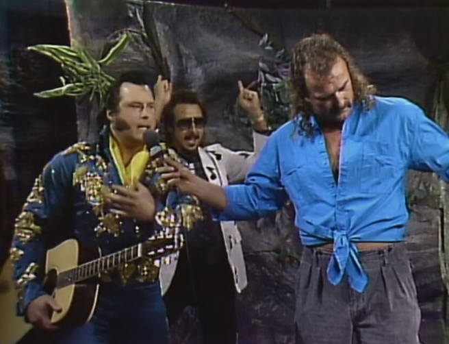 Jake is still a heel, and they gave him this chat show to counter the babyface chat show of Roddy Piper. His guest is the Honky Tonk Man. Honky claims he was born on a pool table in Memphis and that’s why he’s the Honky Tonk Man.