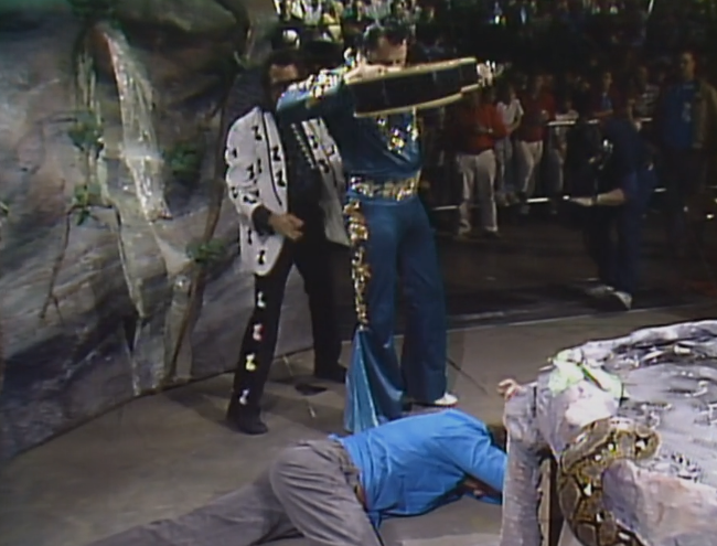 Both wrestlers’ gimmicks are that they’re fucking stupid. Kamala uses a whip and hits a top rope splash (urgh) for the pin. This was awful. “He’s out cold, like a Jewish salami” – Johnny V. What does that even mean? We go back to the studio and Monsoon says that match was from Maple Leaf Gardens. It was from November. Why did we get that? What was the point?