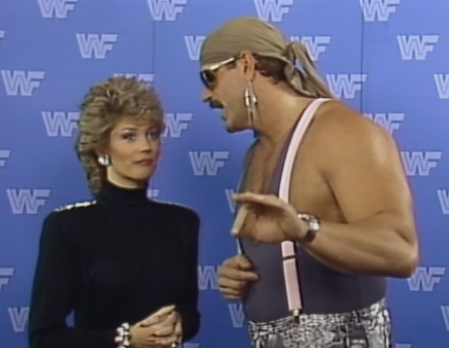 In Jake’s corner; Alice Cooper! In modern times they’d have him sing Jake to the ring. “Feed My Frankenstein”* would have worked great! We also have Bob Uecker signed for Mania. Bobby Heenan chats to Uecker and he tries on Heenan’s sparkly jacket. Mary Hart has been named timekeeper for Mania. Mary was host of Entertainment Tonight.