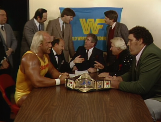 Anyway, this is what contract signings used to look like! The belt on the table, the contracts with Jack Tunney (BOOOOO!), the onscreen ‘president’ of the WWF, and Heenan chatting with Gene Okerlund in the background, plus a bunch of suits. Okerlund hosts the whole thing from a seated position behind Hogan. It’s so weird seeing something so out of control compared to Vince’s obsessive blocking ever since. Heenan does a lot of the heavy lifting here, disparaging Hogan. Meanwhile, Hogan just stares a hole in Andre and rambles about how “you’re both sick”. “I’d have given you anything, man, you’re bigger than the world title to me”.