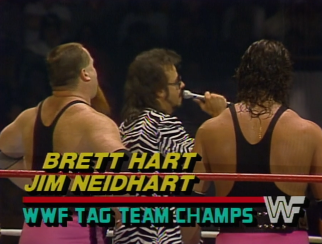 This is the main event of the Toronto show most of the matches have come from this week. Killer Bees are a couple of nerds, who have switched to yellow trainers called “bee boots”. The Harts work over B. Brian Blair with a series of rest holds. Bret(t) throws him to the floor, and we get Masked Confusion. Although the Harts have improved a lot recently, this doesn’t help against the Killer Bees. They still have zero chemistry. Blair comes in blind with a sunset flip for the pin. Stripy cheats! B. Brian Blair, you are punk! Iron Sheik looming large for B. Brian.