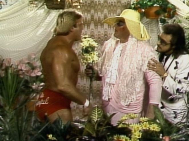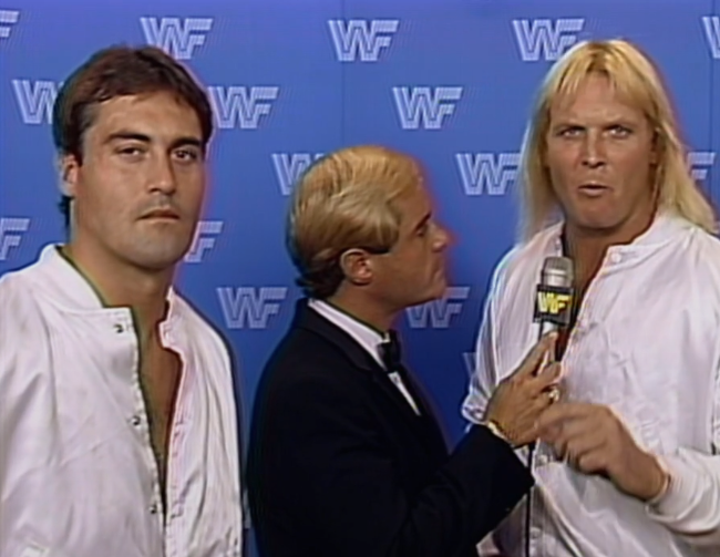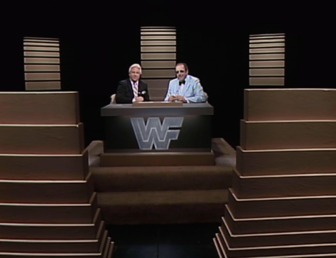 We go back into the studio and Heenan says he didn’t see a trip from Valentine, but figures Haynes would fall over anyway because he’s so awkward. A character assassination from Bobby there. Gorilla promises a “scientific match” next, which means two babyfaces. Heenan suggests if anyone needs the bathroom, they should go now.