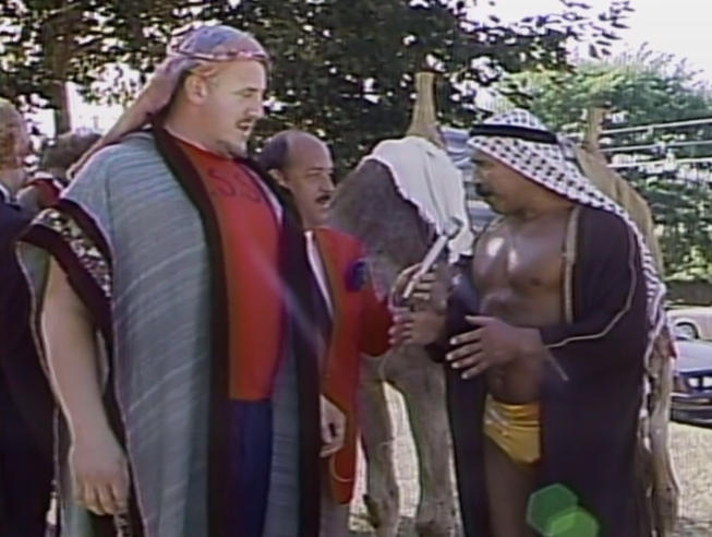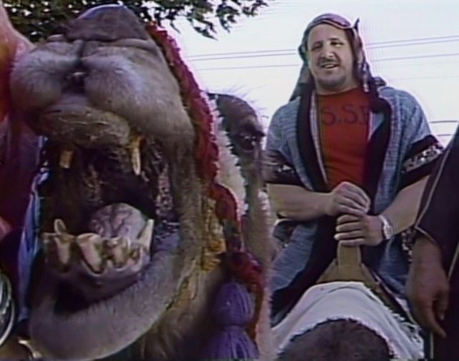 We cut to Tuesday Night Titans, when Gene Okerlund interviewed Sheik & Volkoff. Sheik has his own private camel, so they’ve dressed Volkoff up and stuck him on the back of a camel. “Is very smooth and good animal” – Sheik.