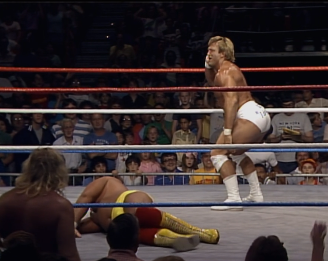 Howard Finkel and Hulk Hogan both treat Orndorff like an afterthought. Orndorff just stands in the face corner shaking his head. Orndorff still works like a superstar babyface here. He batters both big heels in an incredible shine sequence.