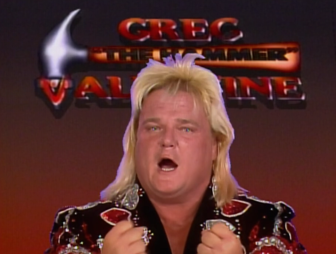 Two big changes over last year. We’ve switched from 20 to 30 participants to beef it up a bit and we’re really pushing the “every man for himself” aspect of the Rumble. Double reinforced by putting on a heel-heel match right beforehand. Greg Valentine triple reinforces this by saying he can’t trust Jimmy Hart or Honky Tonk Man, just himself. He looks like someone put a wig on a side of gammon.