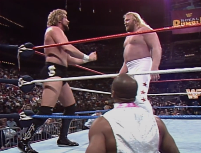 In all we get some 6-7 minutes of promos before the match. Hogan concludes by referring to himself as “the champ”. Hey, I’m sure the perfectly sane Randy Savage will enjoy hearing that. Here comes the Ax and here’s comes the Smasher. They’re #1 and #2 in the Rumble match-ah. They fight each other because it’s EVERY MAN FOR HIMSELF. Well, this is news to me. If only someone had mentioned it beforehand. #3 is Andre, which causes a lot of murmuring in the crowd. Good lord, he’s fallen apart since 1988. He’s really finished now. It’s staggering they got another year out of him. #4 is former AWA champion Mr Perfect. #5 is former NWA champion Ronnie Garvin.