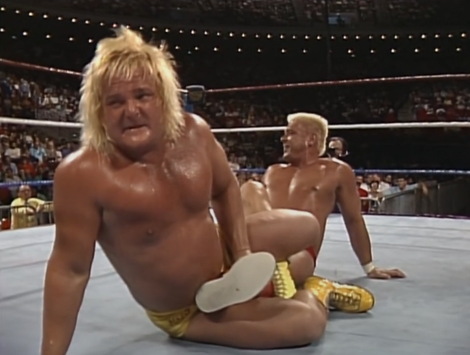 Bushwhackers and Brutus Beefcake? What a card. This is another bad match, not that I need to tell you that. Poffo comes out here with his fancy behaviour, which provokes Ventura to call him “light in the loafers”. Good grief. It wouldn’t be the first time the WWF had presented an evil gay man and it won’t be the last. Pat Patterson with some Naked Lunch level of self-loathing here.