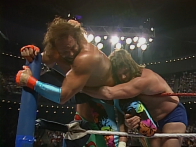 The heels make fun of Dusty’s weight, which is rich coming from Bruce fuckin’ Pritchard. Savage and Dusty run in and Macho kicks Dusty’s ass. Vince McMahon’s obsession with burying Dusty for daring to refuse to be his ace back in 1984 is bizarre to see. Especially as Rhodes is basically finished in the ring anyway and just here to collect some paycheques.