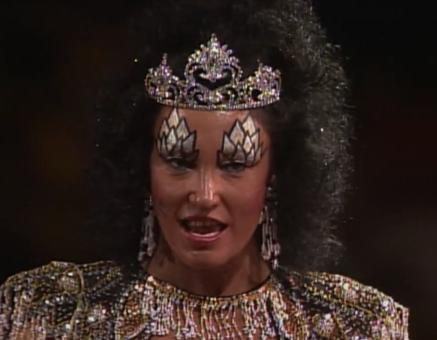 The more I see Bruce Pritchard’s big red face, the more I want to punch it. It might just be the revivalist country music he has playing in the background. Or it might be that Bruce Pritchard is a stooge. Either way, I guess he’d consider it “good heat, brother”. His guests are Sensational Queen Sherri and Sweet Sapphire. Oh good lord, Dusty Rhodes vs. Randy Savage is one of the main feuds from this year. Fuck.