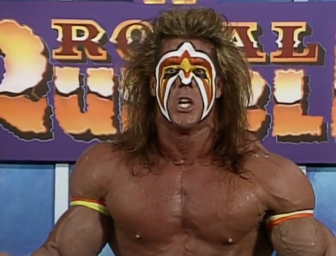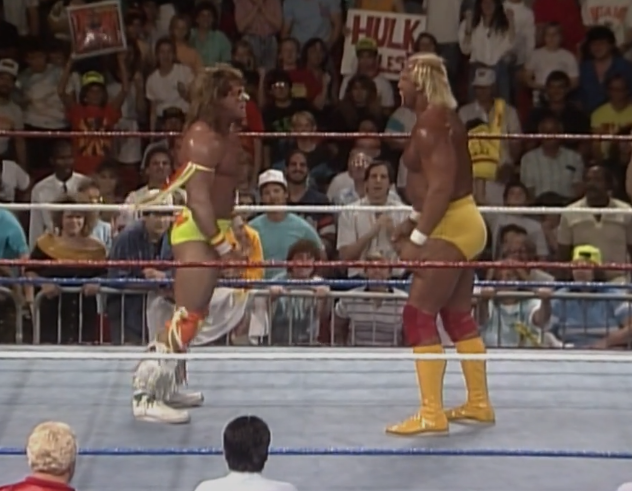 Warrior: “the power of the Ultimate Warrior has spread like a virus”. Oh no, let’s get everyone vaccinated against that immediately. Warrior also refers to “28 normal men” instead of 29, so I’m assuming he’s giving Hulk Hogan a pass. Or Andre? Who knows? Maybe he’s talking about the Red Rooster? His yellow IC title belt is sick, by the way, and I wish they still used it. He addresses the 29th man; Hulk Hogan. “You walk on horizons that are close to where I’ve been”. Huh? Does he know what the horizon is? Doesn’t that just mean Hogan is walking far away from him? This is one of many promos that makes Warrior sound exceptionally dumb.